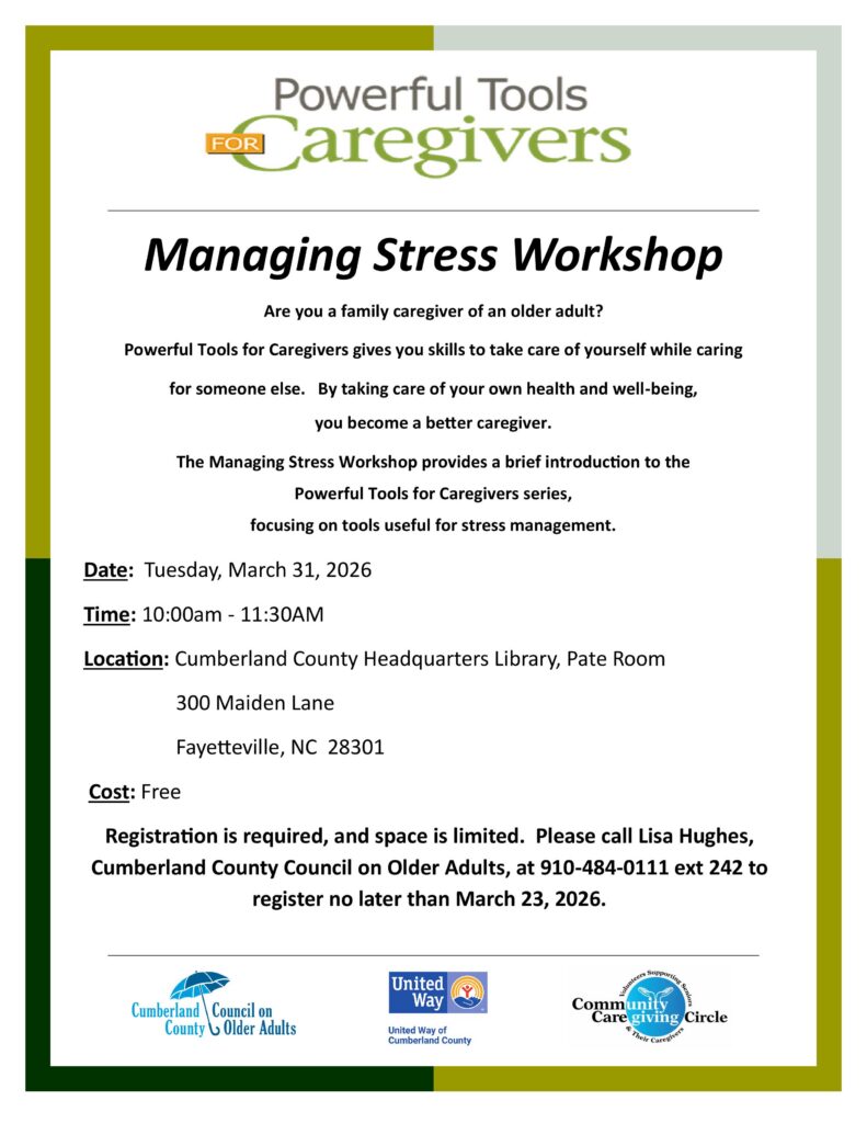 Please note: space is limited and registration is required. This class is appropriate for unpaid family caregivers and not professional/paid caregivers.