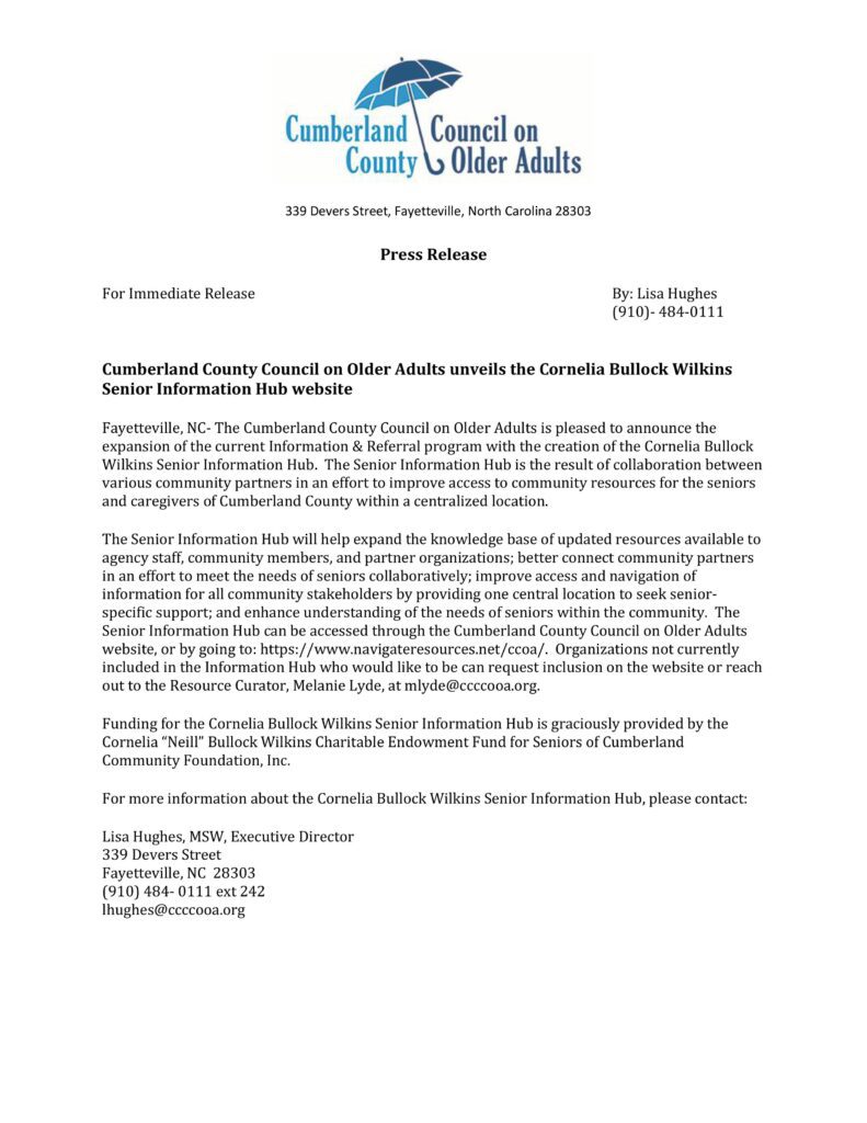 The Council on Older Adults is pleased to announce that the Cornelia Bullock Wilkins Senior Information Hub is now live on the agency website. For more information about where to find the Hub and how to be included in the Hub, please see the provided press release.