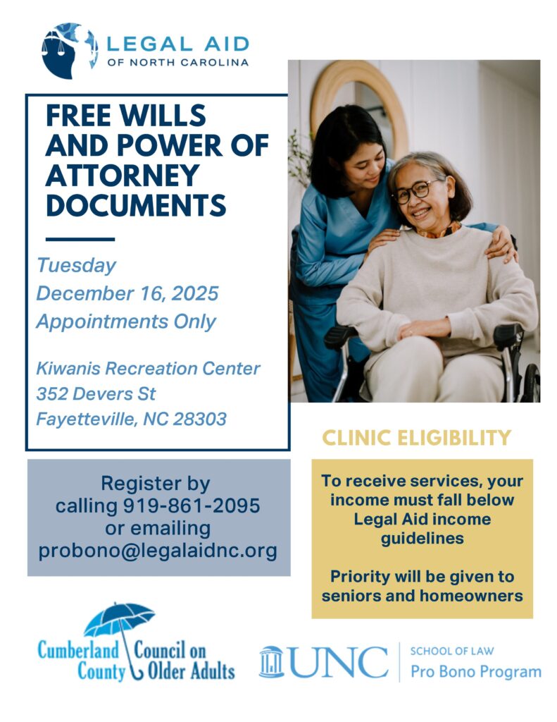 The Council on Older Adults is proud to sponsor an upcoming workshop offered by Legal Aid of NC to provide no-cost assistance with Wills and Power of Attorney documents for those who quality. Priority for service will be given to seniors and homeowners. Registration is required through Legal Aid of NC (919-861-2095).